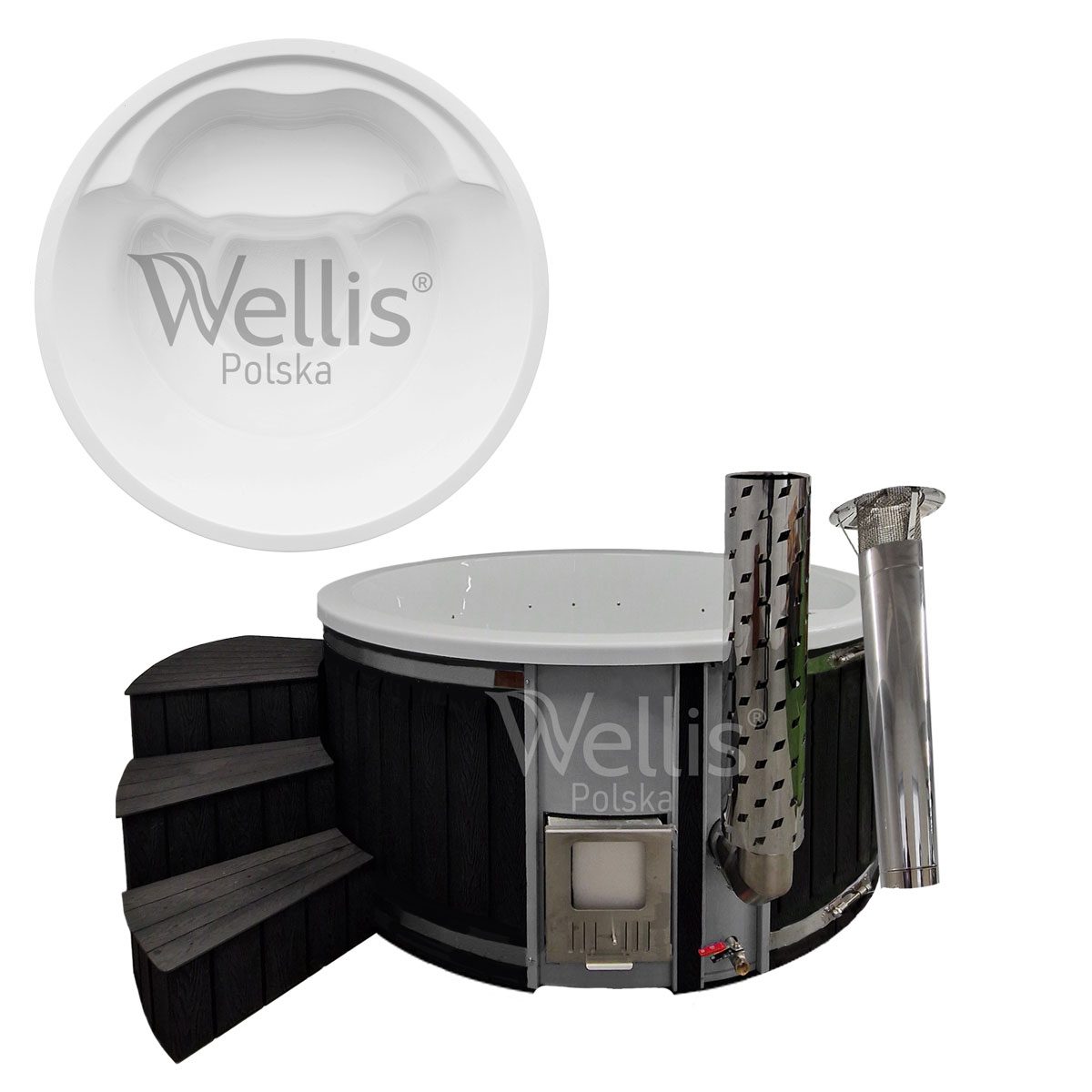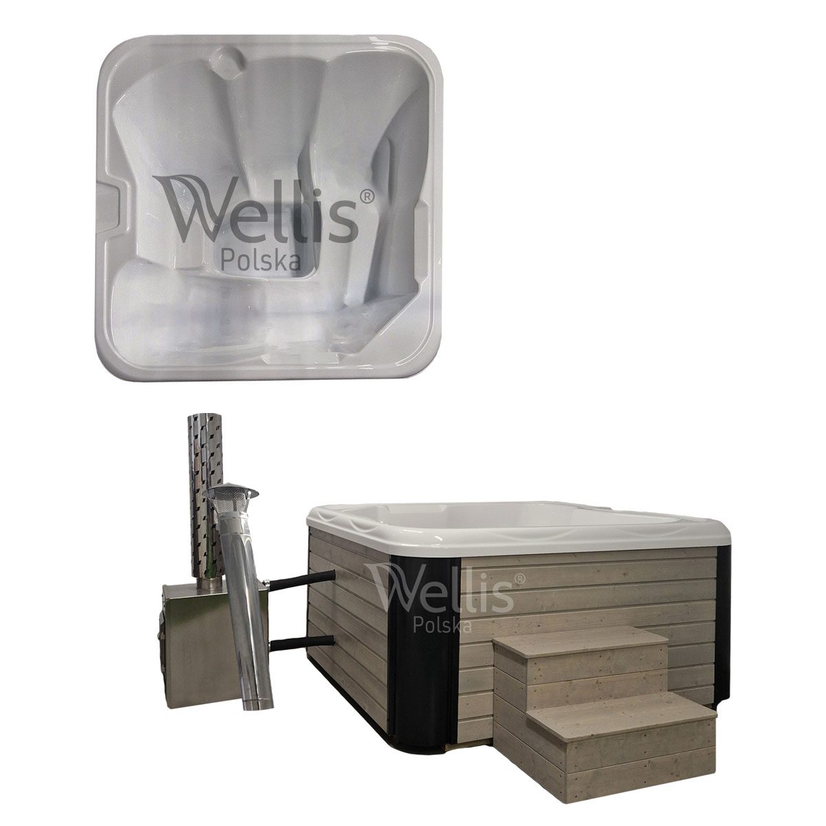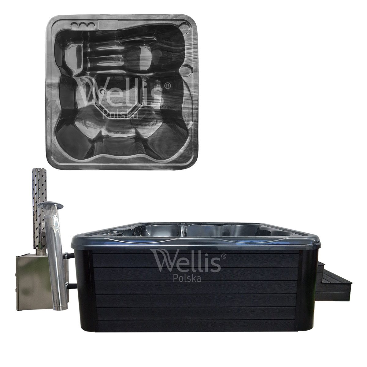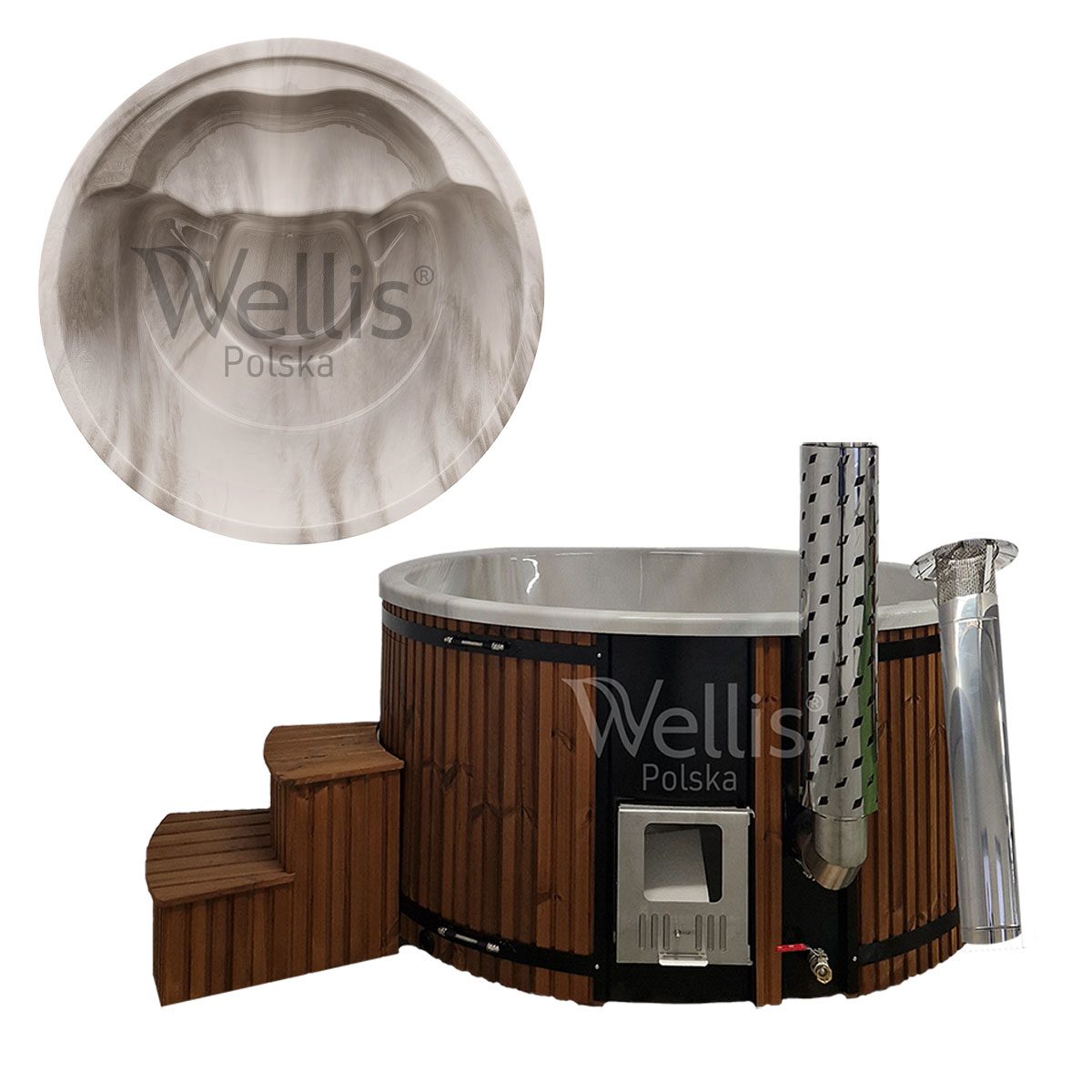| Ogrzewanie | Piec ze stali nierdzewnej S304 36 kW opalany drewnem lub grzałka elektryczna 3 kW z pompą cyrkulacyjną i termostatem |